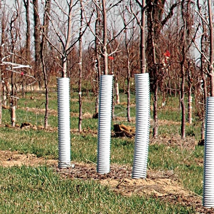 These Corrugated Tree Guards feature an LDPE construction. This material makes them more pliable than other tree guards. These guards measure 2 inches in diameter and 4 feet in length. Sold in bundles of 20. The first few years of growth are vital to young trees. Use these guards to protect your saplings from animals, weather, and equipment during this critical time. Our Corrugated Tree Guards last up to 5 years. The LDPE material is softer than other types of plastic, so it will not scratch tender bark. The UV-treated guards resist both sun and water. This resistance enables them to withstand rain and watering without deterioration.