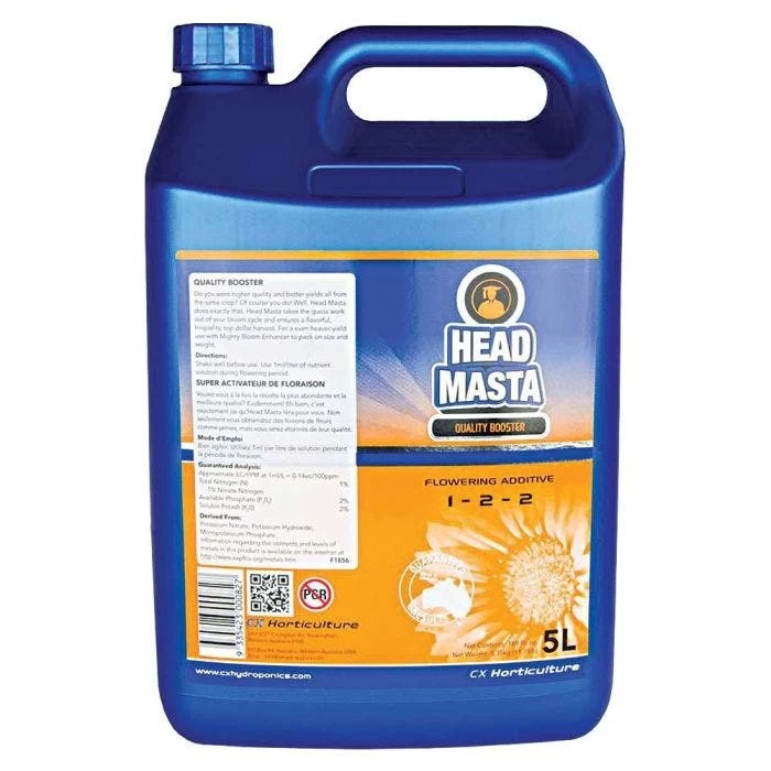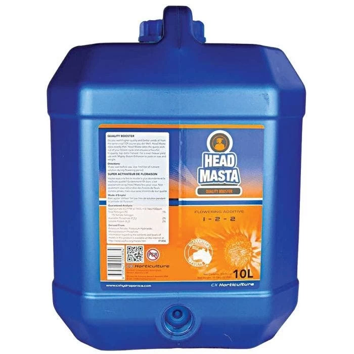 CX Horticulture?s Head Masta contains a blend of vitamins and minerals. This blend pushes your plants? natural factors beyond normal levels. Choose your desired container size below. Head Masta stimulates the hormones responsible for flower formation. These factors encourage the plant to create more flowering sites. An increase of silicon causes the plant to produce larger flowers. Head Masta also prompts the plant to convert excess light and nutrients. It turns this excess into high-quality proteins, amino acids, and carbohydrates. Lastly, it increases a plant?s thirst for potassium, increasing its intake of this valuable element. CX Horticulture developed Head Masta to increase both the yield and quality of your crops. Using this product in your growing system improves both the flavor and aromatic of your end-product. This unique formula also increases your plants? oil and resin production and improves their visual appeal. For maximum efficiency, combine this product with CX Horticulture?s Mighty Bloom Enhancer. This potent combination will give you dense, high-quality flowers cycle after cycle!