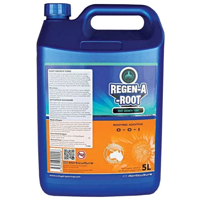 CX Horticulture developed their Regen-a-Root system to stimulate plant root development. This unique growth tonic contains no growth hormones. Instead, it provides your plants with what they need to produce auxins naturally. Choose your desired size below. Regen-a-Root ensures maximum nutrient uptake during all phases of growth and bloom. This uptake encourages massive root growth and boosts root immune defenses – all without sacrificing any top growth. Regen-a-Root works in all types of hydroponic, soil, and coco-based systems. Many products stop working after a plant’s vegetative period. Regen-a-Root continues working throughout the plant?s entire life cycle. Its low mix rate of 4 ml per gallon makes it the most cost-effective rooting additive on the market. CX Horticulture guarantees Regen-a-Root will give you a lush, healthy, and productive root system every time!