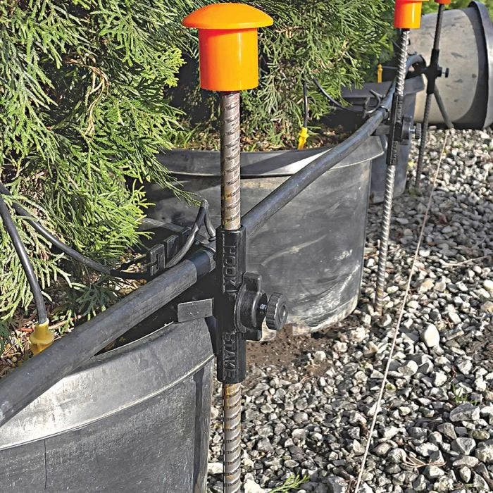 The HookStake is a device used to secure potted plants to any round stake up to inch diameter. It is installed with a single thumb screw and allows for easy adjustment and removal of potted plants. It helps with faster and more efficient crop rotation without tools or pulling up stakes, maintains plant spacing and location, and secures and protects irrigation lines.