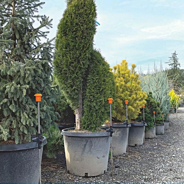 HookStake securely keeps drip lines off the ground, reducing damaged parts and rodent damage. This feature prevents container blowover, drastically reduces plant damage, and reduces labor cost of picking up fallen plants.