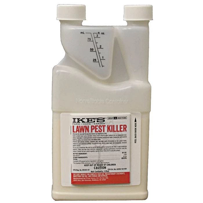 Lawn Pest Killer is an insecticide that targets both indoor and outdoor pests. This product contains the active ingredient Bifenthrin. This bottle contains 16 ounces (1 pint) of liquid concentrate below.