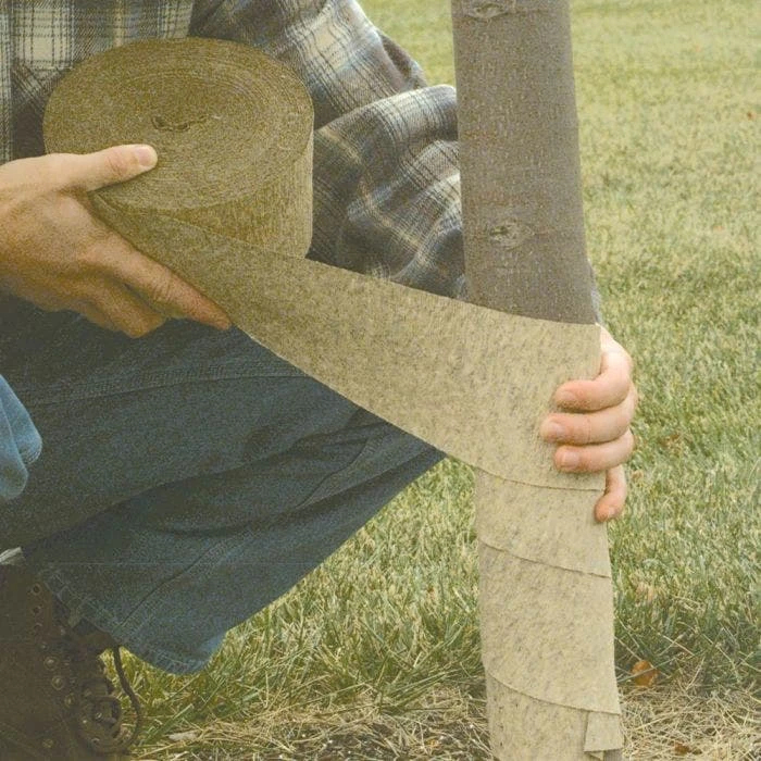 Waterproof, crinkled to 33 1/3 stretch. Protect fruit and shade trees against sun scald, moisture loss, insects and shipping damage. Tie with jute twine. 150 ft per roll. Priced per roll.